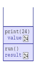 10.As the computer executes the method atop the stack, run, it sees that the method invokes print. It thus pushes print(24) onto the stack. In fact, printwill push additional methods onto the stack, which are all eventually popped off.