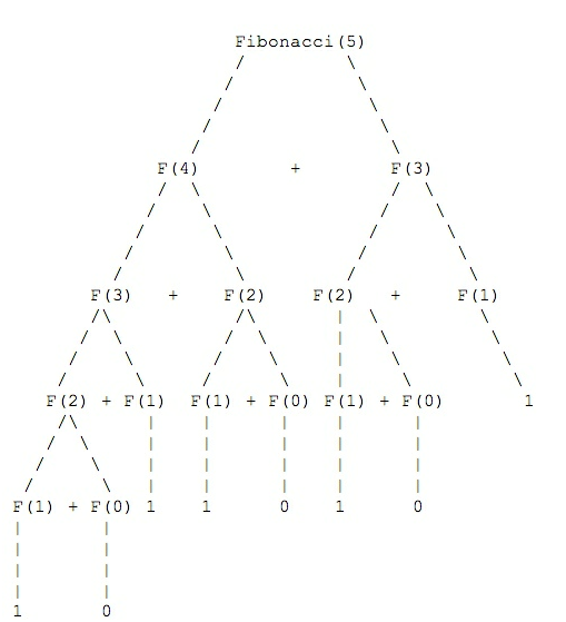 所以,fibonacci(5)的执行顺序会是首先到最左下角F(1),然后回到F(2),然后再到F(0),这样F(2)就执行完毕了。接下来是F(3)的执行,因为F(2)已经得出结果了那么就只需要算F(1)。然后回到F(3),来到F(4)。F(4)的右子树没有被遍历,所以这次会使用相同的方法计算出F(2)。这样F(4)的结果就算出来了。然后回到顶点,开始算顶点右边那个节点F(3)。方法同Fibonacci(5)左边的遍历方法相同。这样就完成了一次递归的计算。