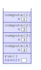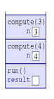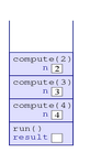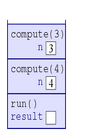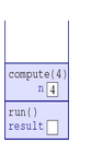 2.When the computer sees that run() invokes compute(4), the computer places a new frame atop the stack corresponding to compute; this frame will include the variable n, whose value is initially 4.
