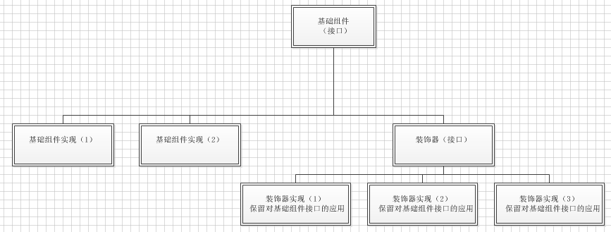 今天该讲第三种设计模式 — 装饰器模式。同样,从名字就可以看出这种模式必定有一个基础组件,用来被修饰,也会有至少一个装饰器来修饰基础组件。同时要求被装饰器修饰过的组件对外界来说还是一个组件,只不过在被修饰之后多出了一些以前没有的功能。装饰器模式可以看做下图: