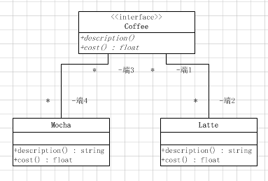 装饰器模式相对于一般的继承,做到了对类的行为的扩展的同时,避免了从父类继承来的不必要的东西,其实是使用了组合的方式来达到的。那么下面就来看看这种模式的具体实现吧。假如有一个咖啡店,卖和多种咖啡,而每种咖啡又可以加上不同的调料,例如奶昔、牛奶等。同时每种咖啡价格不一样,调料的价格也不一样,加过调料的咖啡的价格就是原本咖啡喝调料的总价。咋一看来,似乎继承是一种很好的方式:(如下图)