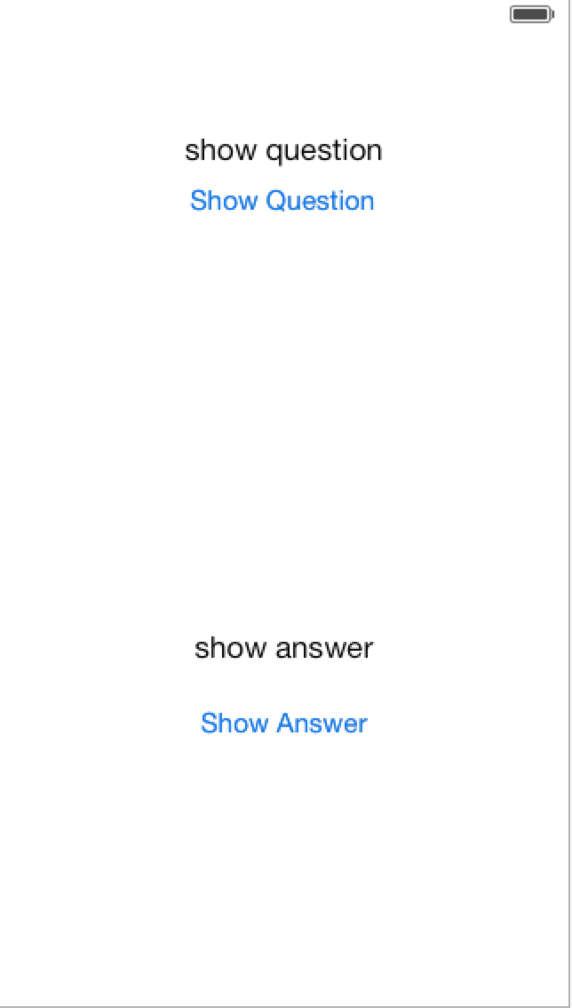 我们接下来实现showQuestion和showAnswer方法了。由于在之前已经把他俩和Interface Builder中的button关联起来了,所以button在被点之后,这两个方法会相应地被调用。我们想要在show question点击的时候在label中显示问题,所以可以这么实现:
