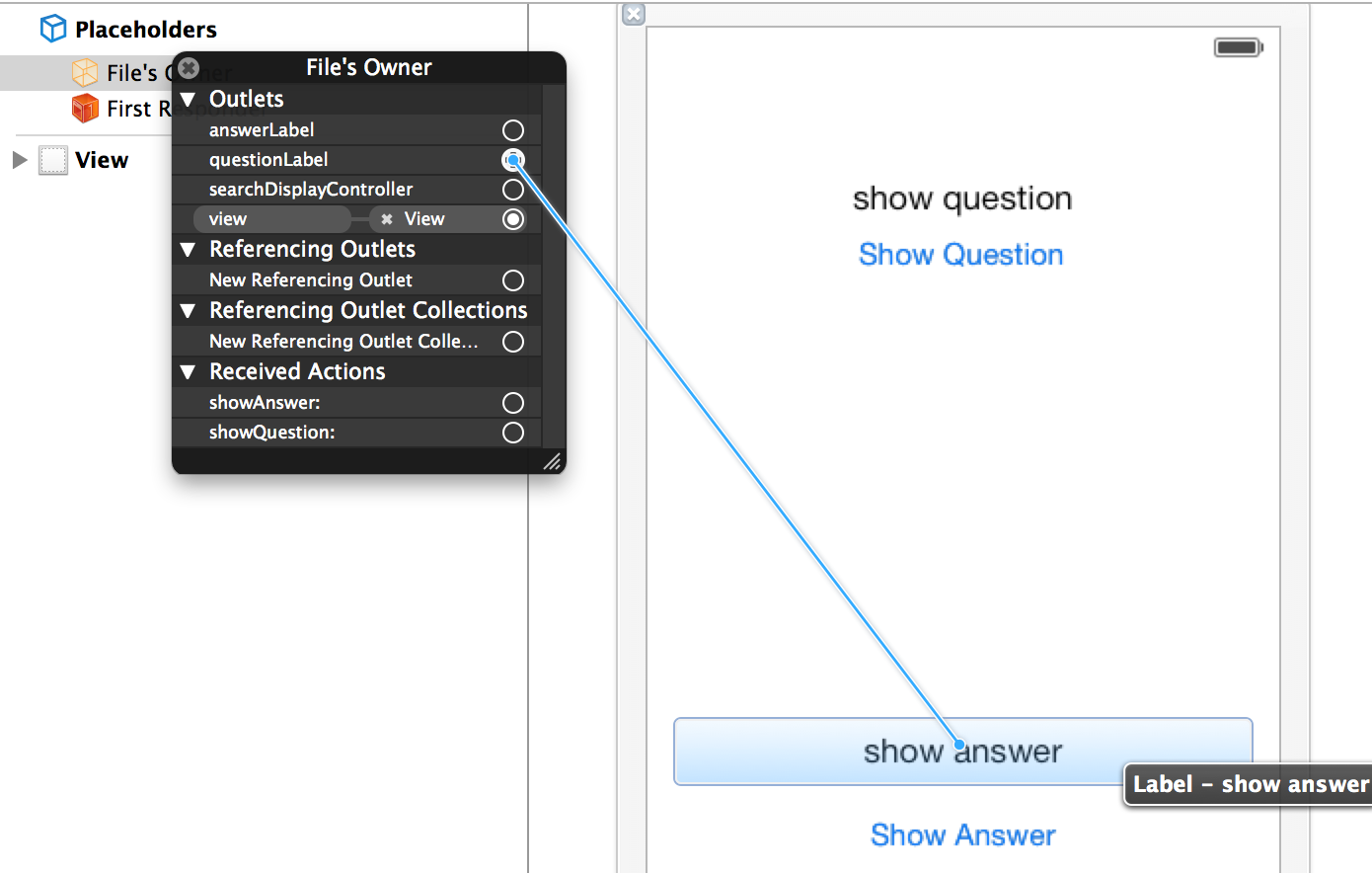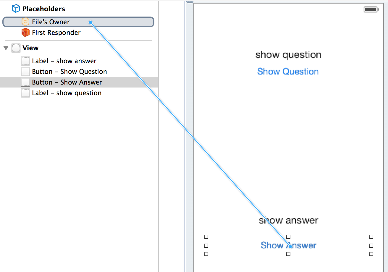 上面代码中IBAction是告诉Xcode,这个方法是用来响应Interface Builder中的事件的。说到这里,不得不提一下Target\Action模式,他是objective-c中的一种消息机制,当用户在view中做出一些动作后,view会发送消息到controller,Target指的就是响应这个事件的对象(在这里就是WUSTLQuizViewController.m),Action指的是Target中的哪个方法具体用来处理这个事件的(在这里Action分别是showQuestion和showAnswer方法)。这时我们再回到xib文件中,点击Interface Builder中的button,然后按住不放拉出一条线并在Placeholder中的file‘s owner松开(control-drag):