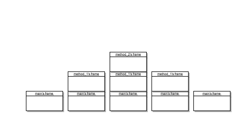 当一个方法被执行的时候,系统会从栈中分配出一定的内存让代码在其中运行,这一块专门分配出来的内存叫做frame,每一个方法都有一个frame。当方法从main方法中开始执行的时候,main方法的frame被放到了栈上,然后如果在main方法中有其他方法的调用,就会有不断的frame被加到栈上,下图就是在一个栈上不断调用和结束调用方法的对应的frame结构: