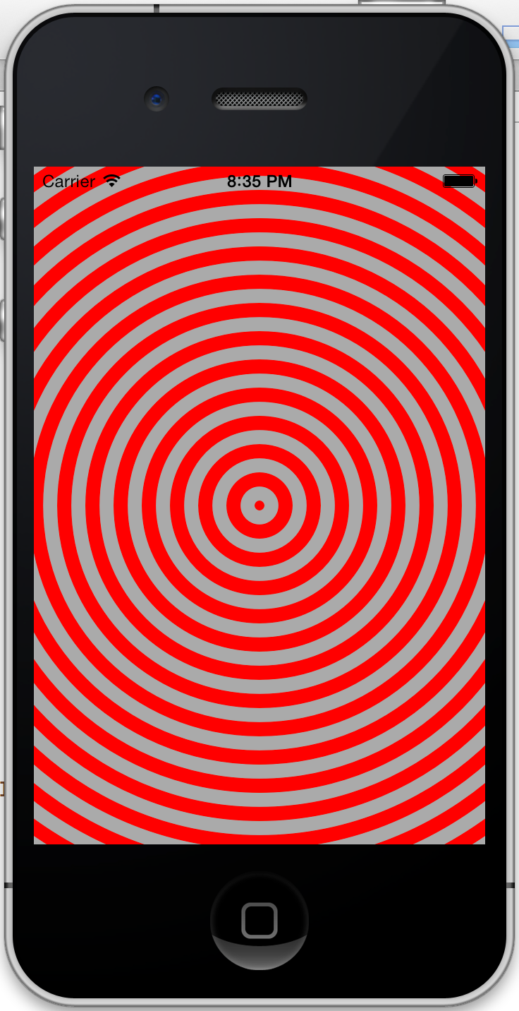 现在我们来做一点有意思的事情:画同心圆. 我们之前说过,如果需要自定义一些drawing,需要在drawRect方法中进行,当xCode发现drawRect方法不是被注释的情况下,会对UIWindow中的每一个view应用drawRect方法中定义的drawing.所以现在我们来到drawRect方法中做一些改变,最后达到的效果就如下图所示: