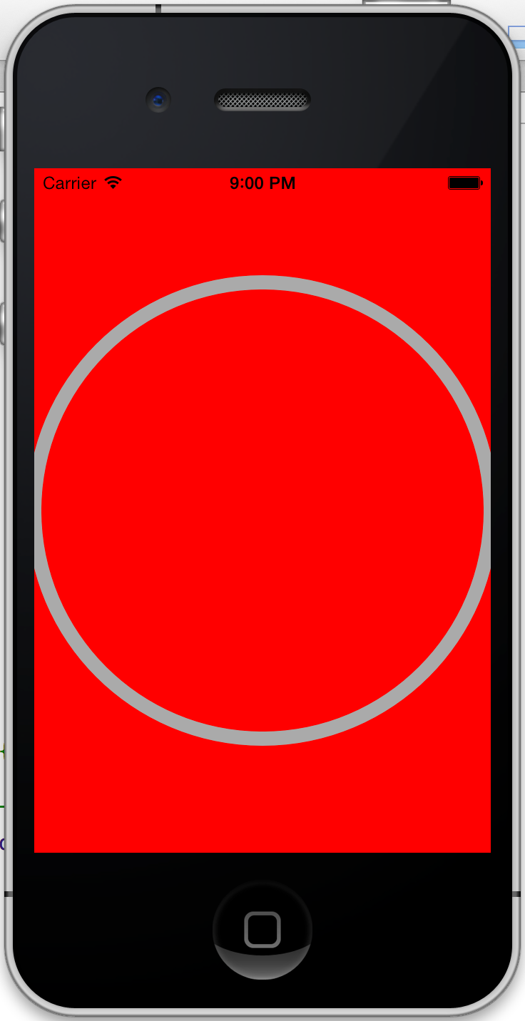 定义好了圆心和半径,就可以开始画圆了.在objective-c中有一个很常用的画图类,叫做UIBezierPath,这个类里面定义了很多方法可以用来作图,当然画圆也不在话下.通过查看这个类的API,我们发现有一个叫做addArcWithCenter:c radius:r startAngle:s endAngle:e clockwise:的方法可以用来画圆,参数分别的含义是圆心,半径,起始角度(0),终止角度(360)和顺时针/逆时针(这里无所谓).最后定义好一切之后就需要作图了,调用UIBezierPath类的stroke方法即可:
