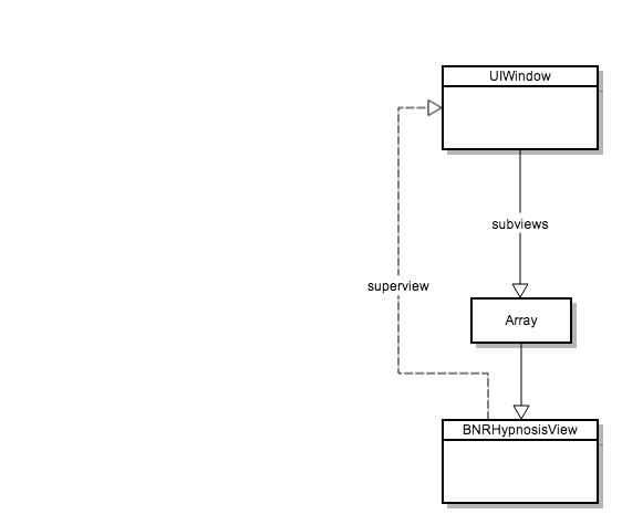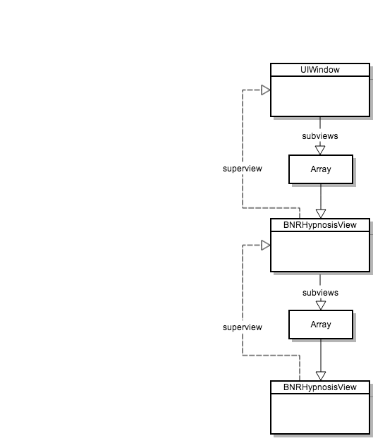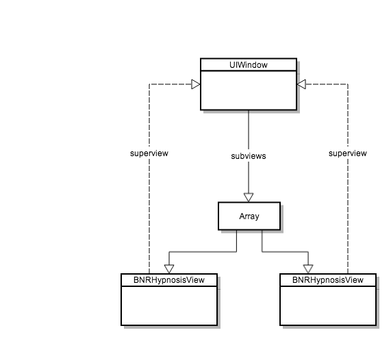 此外,当加入一个subview的时候,subview指向superview的关系自动被创建,不过为了避免强引用环(strong reference cycle),subview指向superview的引用被设为weak(图中虚线部分)。