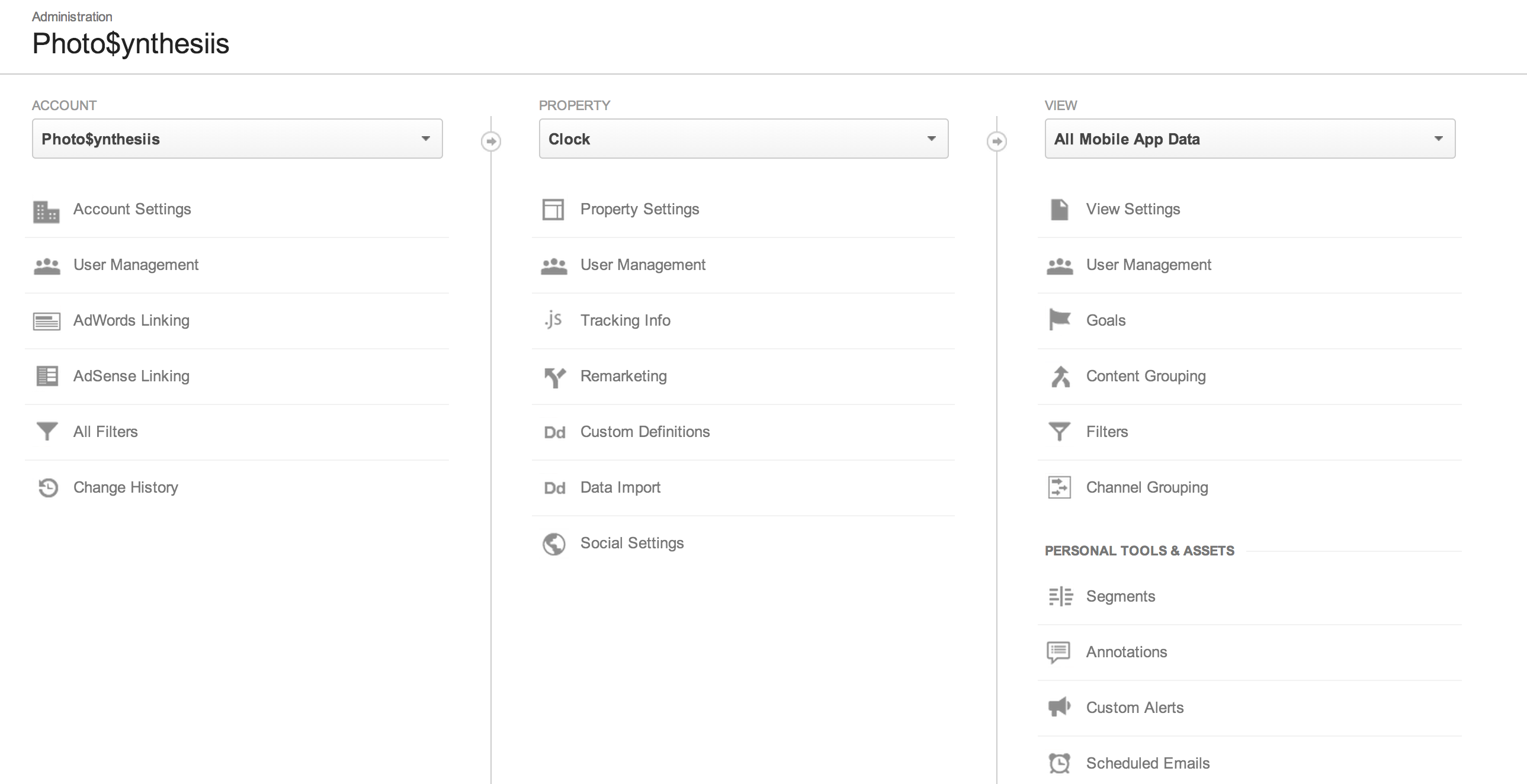上图是Google Analytics的dashboard,里面有三个column,分别是account,property和view.