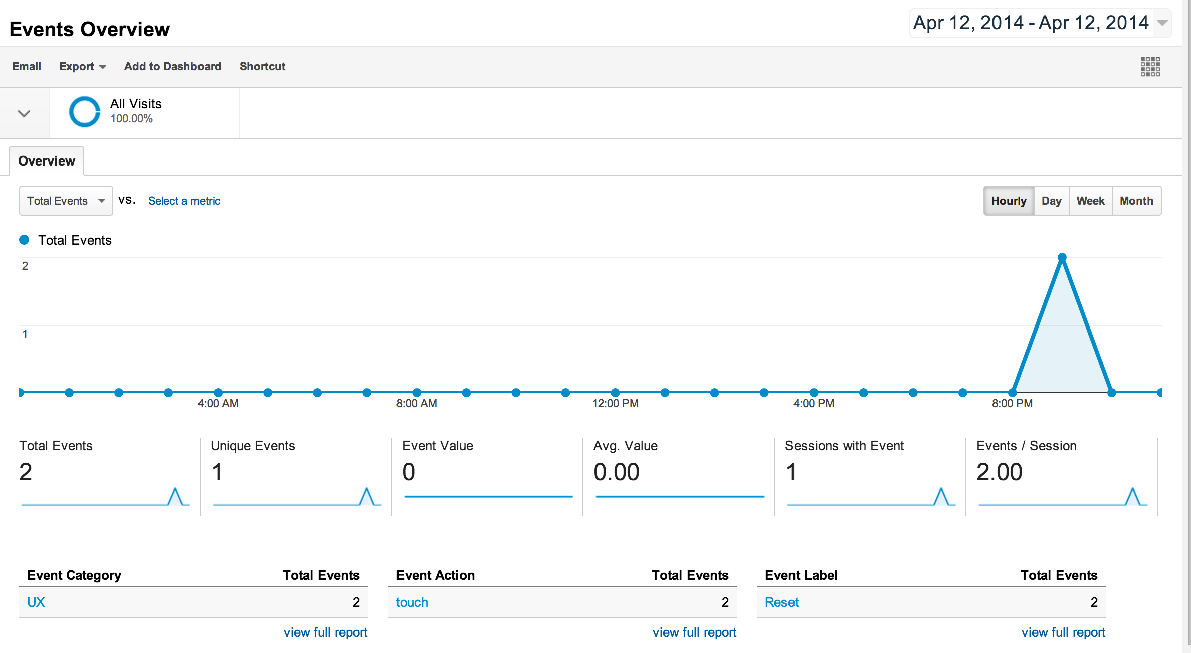 上面的代码首先得到一个tracker,然后设置当前view的名字,因为这次我们不是记录用户浏览屏幕的行为,所以不像之前那样发送view到server,这次我们track的是用户点击按钮的事件,所以我们创建一个touch事件,这个事件被Google framework归类到了UX事件中,然后我们以被按的按钮的title作为事件的title然后传送到server上去.最后一步把screen name重设为nil是为了防止其他事件使用这个名字,因为tracker是共有的对象,在一个地方设置的state会影响另一个地方的使用,所以除了应该共享的state之外,在设置后应该还原.