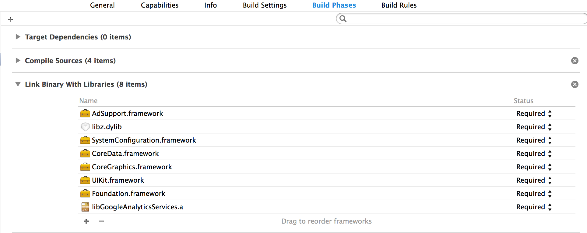 接下来把libGoogleAnalyticsServices.a文件拖到项目的framework文件夹下,其实你把它放到项目的哪儿都无所谓,只是这样更好管理一些.点击项目名称(Clock),然后在右边的窗口中点击build phases,展开Link Binary With Libraries点击左下角的+然后在搜索栏中输入CoreData,然后选中并点击Add.重复上面的过程,并把SystemConfiguration.framework和libz.dylib引用进来.
