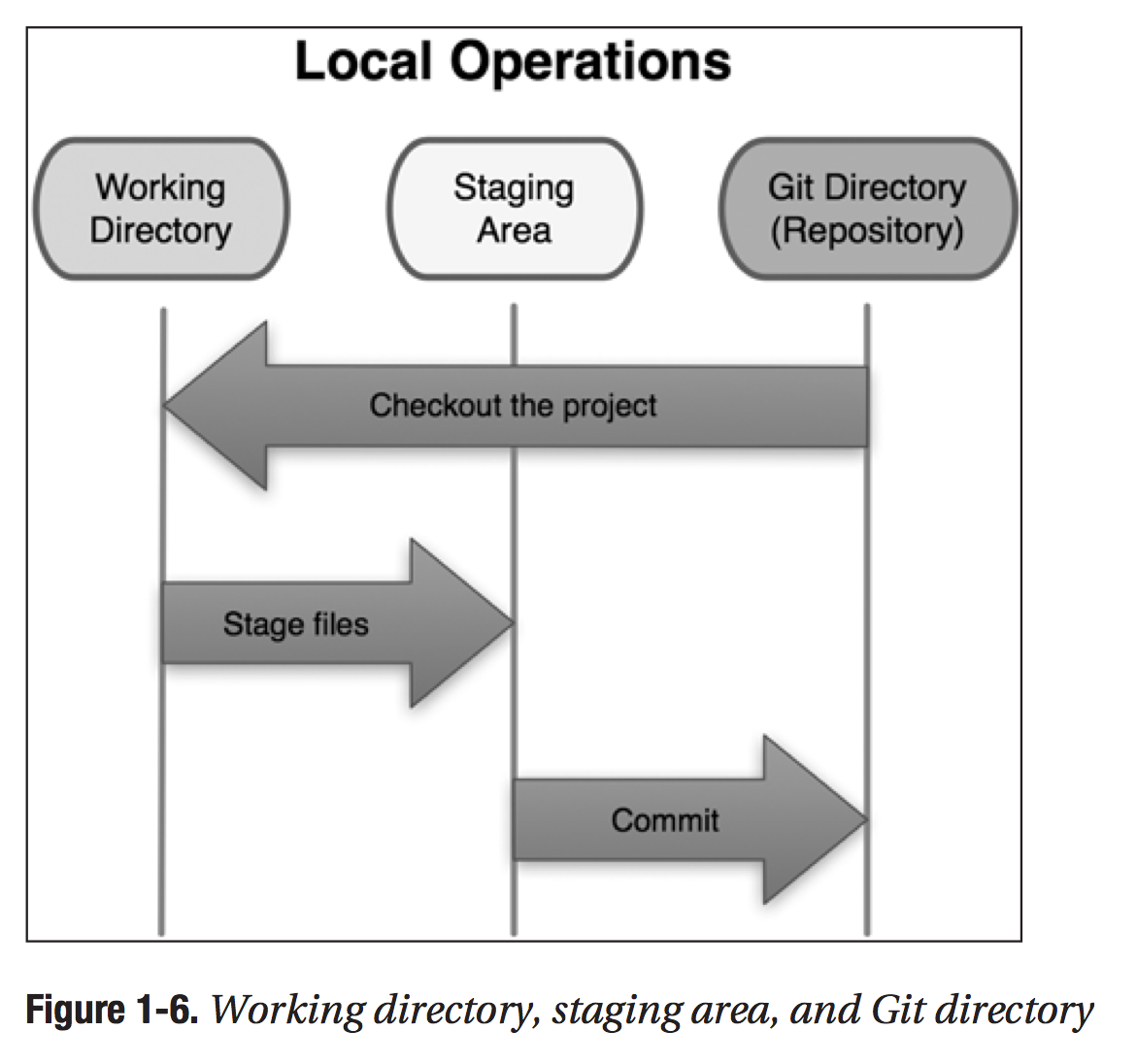 在上图中的最左边和最右边分别是Working Directory和Git Repository.后者是从server上下载下来的所有文件,前者是后者中的其中一个版本,用户做的修改和增加都在Working Directory里面进行.