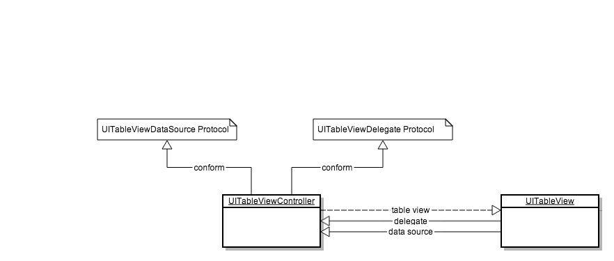 UITableViewController同时兼顾了view controller, delegate和data source这三个角色.UITableViewController继承自UIViewController,所以它有自己的view,这个view就是UITableView.UITableViewController负责UITableView的准备和显示.同时UITableViewController遵循了UITableViewDataSource和UITableViewDelegateProtocol,所以它既是data source又是delegate.