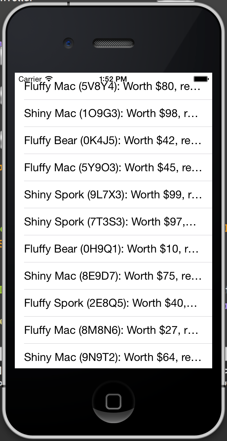 接下来我们就应该往里面加数据.需要复用在前几章建立的BNRItem类,这个类代表了具体的商品.接下来还需要建立一个BNRItemStore类,我们的tableview controller会从这个store里面获取数据.具体怎么建立的这里就不阐述了,总之这个store有createItem和allItems两个方法,前者用来创建item后者用来获取所有的item用来显示.现在我们可以创建50个item用于显示: